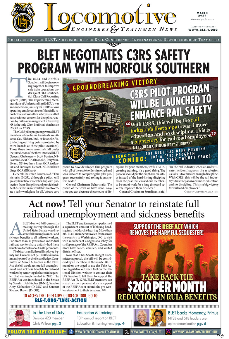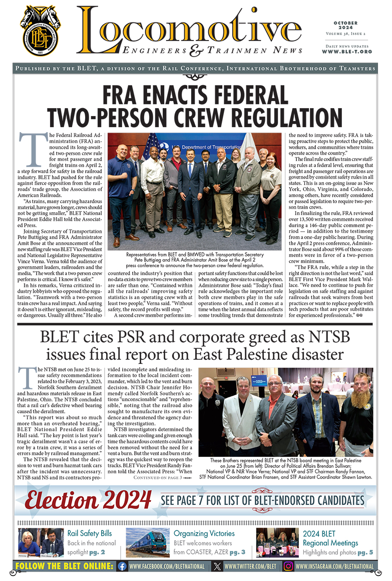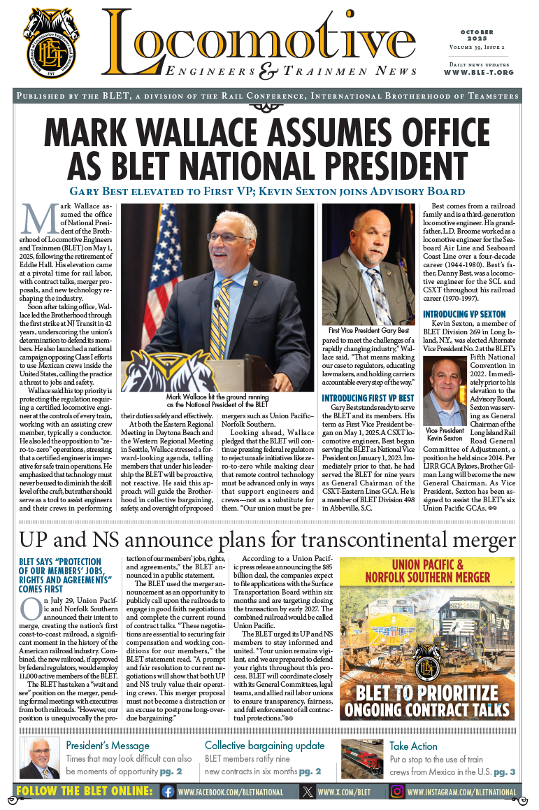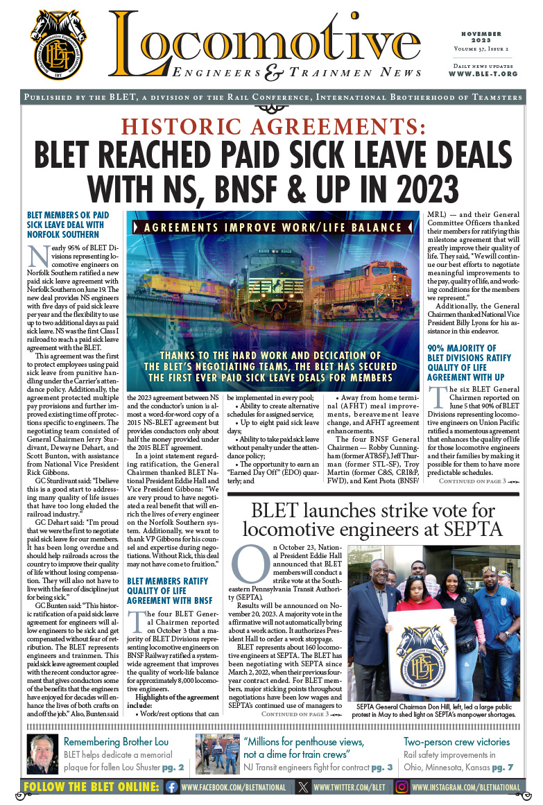 BLET Newsletters View and download current and previous BLET Newsletters below. October 2025 March 2025 October 2024 March 2024 November 2023 January-March 2023 2022 Newsletters August / September 2022 April – July 2022 January-March 2022 2021 Newsletters August / September 2021 June / July 2021 March-May 2021 January / February 2021 2020 Newsletters October-December 2020 September 2020 July / August 2020 May / June 2020 April 2020 February / March 2020 January 2020 2019 Newsletters November 2019 August-October 2019 July 2019 June 2019 April / May 2019 February / March 2019 January 2019 2018 Newsletters November 2018 October 2018 August / September 2018 July 2018 June 2018 May 2018 April 2018 March 2018 February 2018 January 2018 2017 Newsletters November / December 2017 September / October 2017 August 2017 July 2017 June 2017 May 2017 April 2017 March 2017 February 2017 January 2017 2016 Newsletters November 2016 October 2016 September 2016 August 2016 July 2016 June 2016 May 2016 April 2016 March 2016 February 2016 January 2016 2015 Newsletters December 2015 October / November 2015 September 2015 July / August 2015 May / June 2015 March / April 2015 January / February 2015 2014 Newsletters December 2014 November 2014 October 2014 August / September 2014 July 2014 June 2014 April / May 2014 February / March 2014 January 2014 2013 Newsletters November / December 2013 October 2013 August / September 2013 July 2013 June 2013 April / May 2013 February / March 2013 January 2013 2012 Newsletters November / December 2012 October 2012 September 2012 August 2012 July 2012 June 2012 April / May 2012 March 2012 February 2012 January 2012 2011 Newsletters December 2011 October / November 2011 September 2011 August 2011 June / July 2011 May 2011 April 2011 March 2011 January / February 2011 2010 Newsletters December 2010 October / November 2010 September 2010 August 2010 July 2010 June 2010 April / May 2010 March 2010 January / February 2010 2009 Newsletters December 2009 November 2009 October 2009 September 2009 August 2009 July 2009 June 2009 May 2009 April 2009 March 2009 February 2009 January 2009 2008 Newsletters December 2008 November 2008 September / October 2008 August 2008 July 2008 May / June 2008 April 2008 March 2008 February 2008 January 2008 2007 Newsletters December 2007 November 2007 October 2007 September 2007 August 2007 June / July 2007 May 2007 April 2007 March 2007 February 2007 January 2007 2006 Newsletters December 2006 November 2006 October 2006 September 2006 August 2006 July 2006 June 2006 May 2006 April 2006 March 2006 February 2006 January 2006 2005 Newsletters December 2005 November 2005 October 2005 September 2005 August 2005 July 2005 June 2005 May 2005 April 2005 March 2005 February 2005 January 2005 2004 Newsletters December 2004 November 2004 October 2004 September 2004 August 2004 July 2004 June 2004 May 2004 April 2004 March 2004 2003 Newsletters December 2003 November 2003 October 2003 September 2003 August 2003 July 2003 June 2003 May 2003 April 2003 March 2003 February 2003 January 2003 2002 Newsletters December 2002 November 2002 October 2002 September 2002 August 2002 July 2002 June 2002 May 2002 April 2002 March 2002 February 2002 January 2002 2001 Newsletters December 2001 November 2001 October 2001 September 2001 August 2001 July 2001 June 2001 May 2001 April 2001 March 2001 February 2001 January 2001 2000 Newsletters December 2000 November 2000 October 2000 September 2000 August 2000 July 2000 June 2000 May 2000 April 2000 March 2000 February 2000 January 2000 1999 Newsletters December 1999
