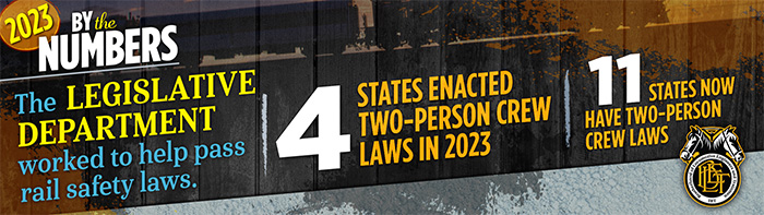 The BLET’s State Legislative Board Chairmen worked tirelessly for their members in 2023 as two-person crew safety laws were enacted in four states in 2023: Ohio, Minnesota, Kansas, and New York. Eleven states now have crew size laws on the book.