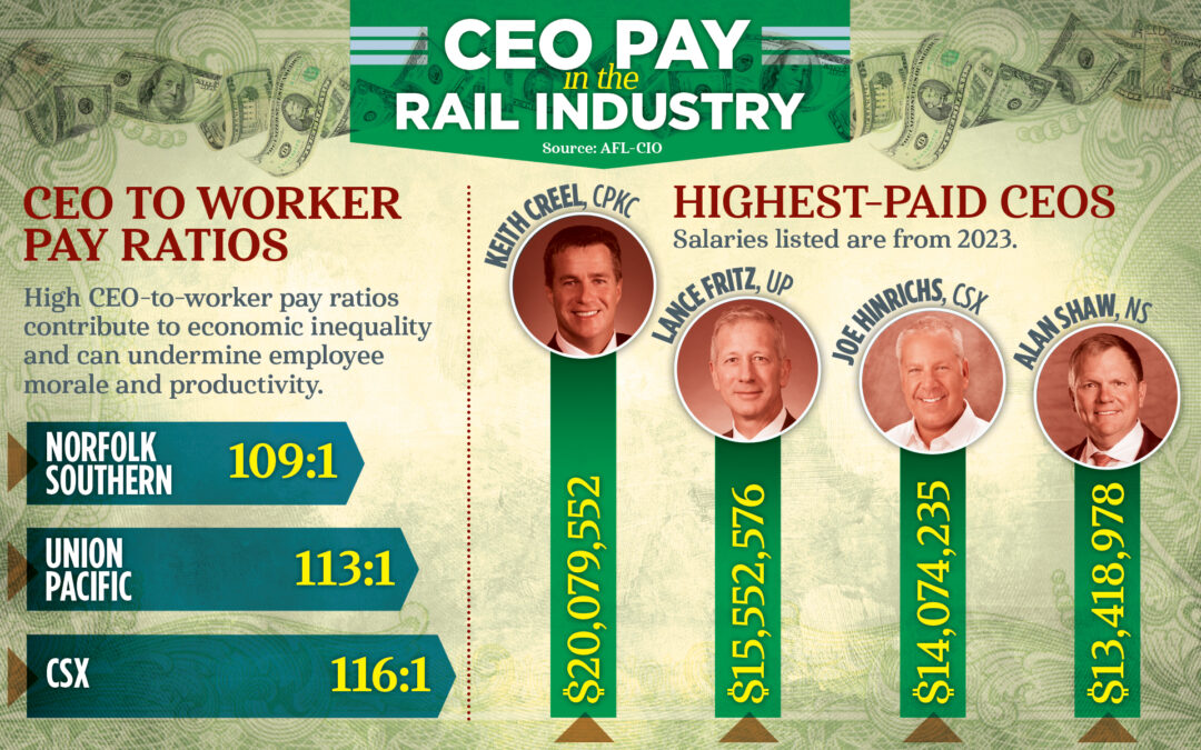The AFL-CIO released its annual Executive Paywatch report which tracks how worker wages have fallen while CEO pay continues to soar. Here are some highlights from the railroad industry: