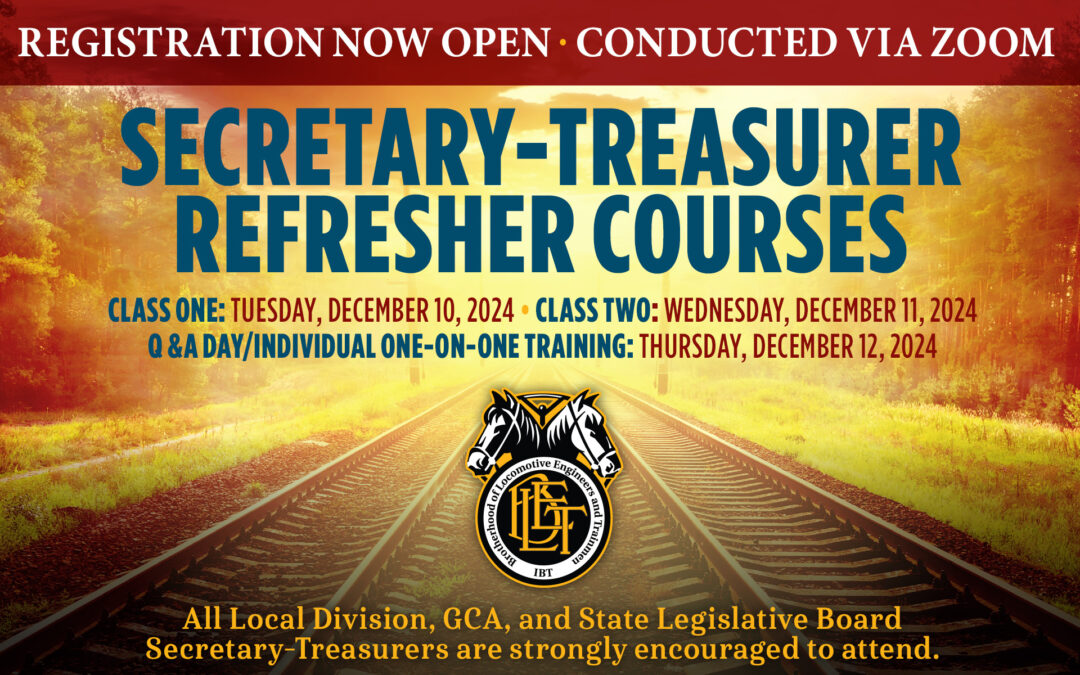All Local Division, GCA, and State Legislative Board Secretary-Treasurers are strongly encouraged to attend. Registration is required by opening the applicable Zoom invitation which will be distributed via email and UnionTrack alert. New Secretary-Treasurers to be installed in January 2025 may participate in the class with the permission of your Division, GCA, and/or SLB. To do so, please email David Estes, National Secretary-Treasurer and Department Head of the BLET Education and Training Department, at [email protected].