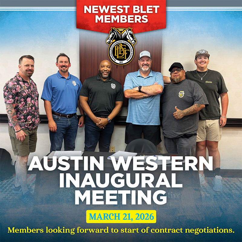 The BLET held an inaugural meeting for its newest members at the Austin Western Railroad on March 21, less than a month after securing an organizing win at the Texas-based short line railroad. National Vice President James Logan Jr., BLET’s Director of Organizing, and Luke Myers, BLET’s Head of the Short Line Department, traveled to Cedar Park, Texas, a suburb of Austin, to meet with workers and discuss what should be negotiated as part of their first contract as well as to collect BLET membership application forms.