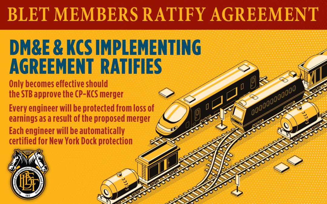 INDEPENDENCE, Ohio, March 3 — BLET members today ratified an implementing agreement with the Kansas City Southern (KCS) and Dakota, Minnesota & Eastern (DM&E) Railroads. The agreement will only become effective should the Surface Transportation Board (STB) decide to allow the merger of the Canadian Pacific Railway (CP) and KCS Railroads.