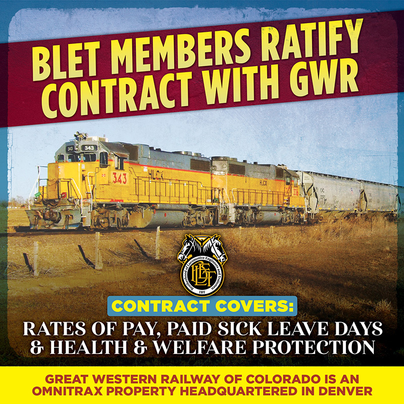 On February 10, BLET members ratified a new contract with the Great Western Railway of Colorado (GWR). The new contract provides pay increases, paid sick leave days, and protects the members’ health and welfare benefits.