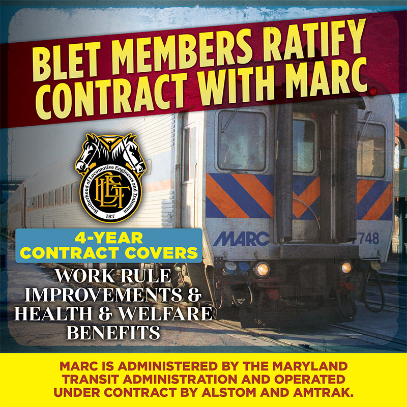 On February 26, BLET members voted unanimously to ratify a new four-year contract with Alstom. The contract cover locomotive engineers who operate Maryland Area Rail Commuter (MARC) trains in the Washington-Baltimore area.