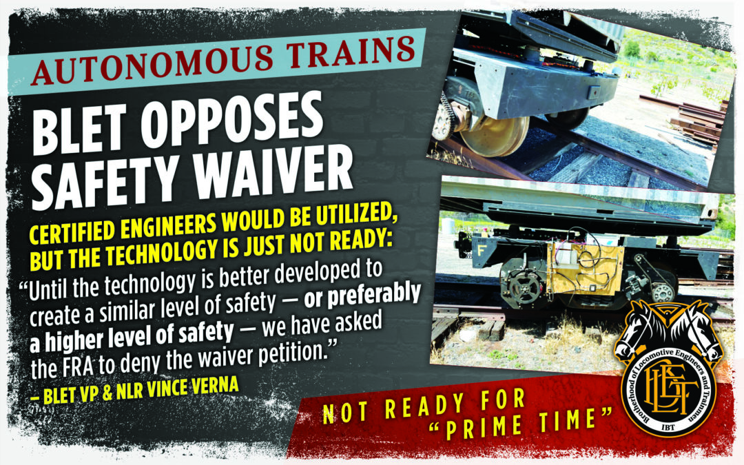 The BLET comments state in part: “While we are pleased that the petitioners have so far committed to utilizing certified locomotive engineers to operate the vehicles, the safety risks are simply too great at this time. Until the technology is better developed to create a similar level of safety — or preferably a higher level of safety — we have asked the FRA to deny the waiver petition.”