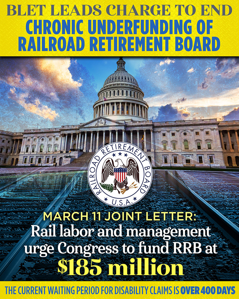 Improved service and full-funding for the RRB is one place where labor and management see eye-to-eye. The BLET’s efforts have been augmented by joint outreach from the International Brotherhood of Teamsters, the Transportation Trades Department, AFL-CIO, Association of American Railroads, and the American Short Line and Regional Railroad Association. A letter from that labor-management coalition can be read here (PDF).