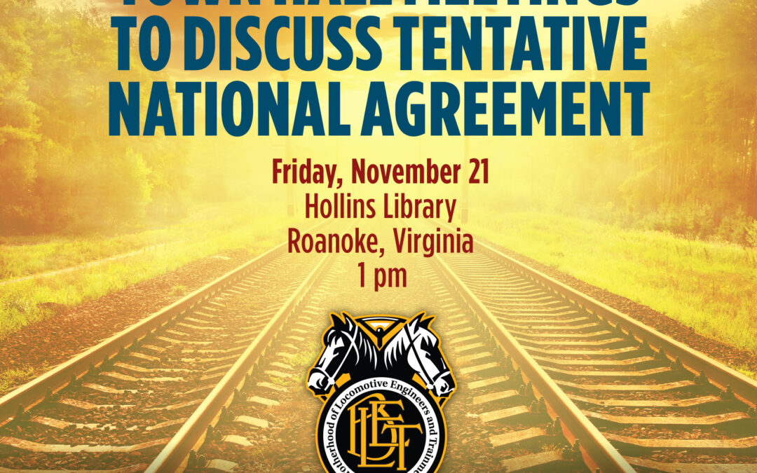 The BLET will host a Town Hall Meeting in Roanoke, Va., on Friday, November 21, to discuss the terms of the tentative national agreement. This in-person meeting will provide an opportunity for members to hear directly from national officers, ask questions, and share feedback.