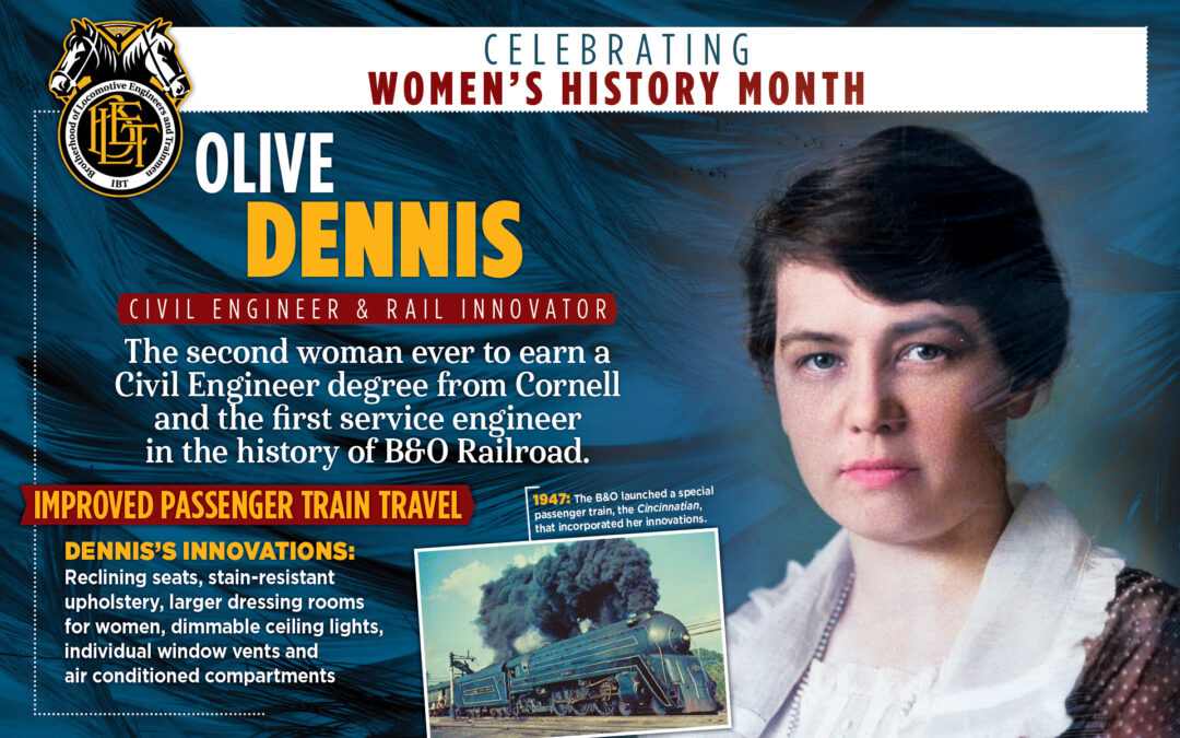 Olive Dennis (1885-1957) was an American engineer whose design innovations changed the nature of railroad travel. In 1920, she became only the second woman to obtain a Civil Engineer degree from Cornell University. She was hired by the Baltimore & Ohio Railroad to design bridges, and soon became the railroad’s first “service engineer.”