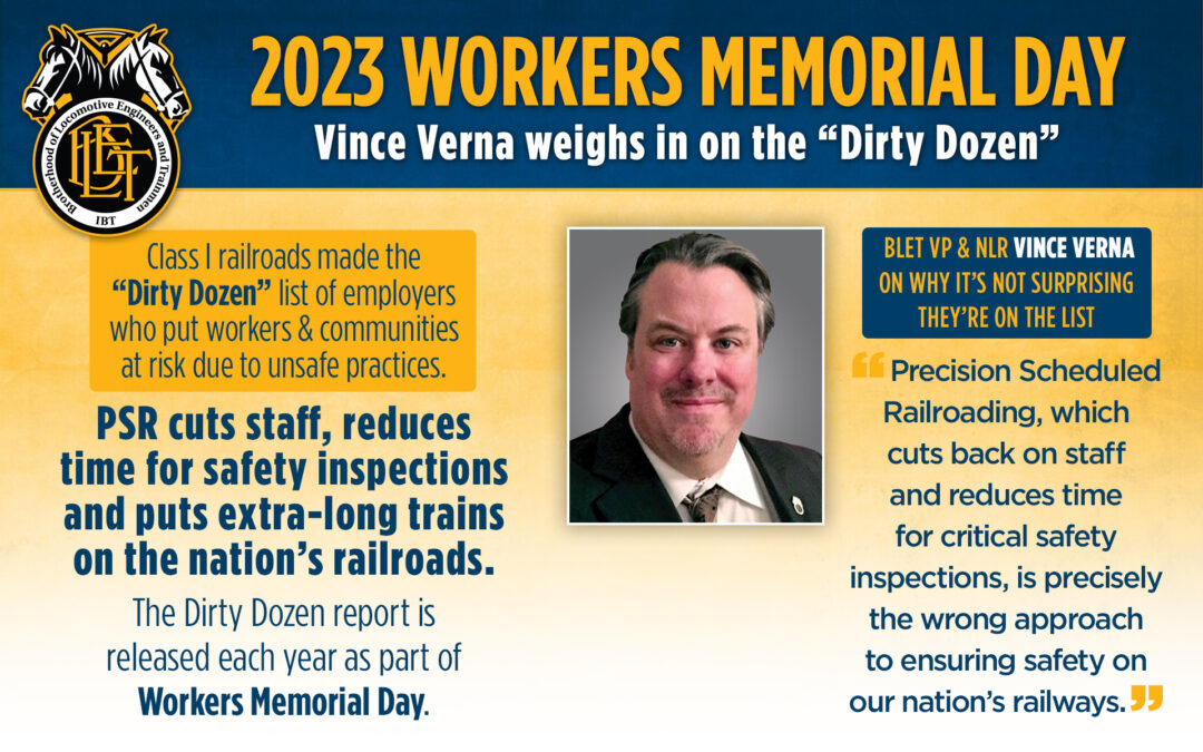 “Unfortunately, members of our union will tell you that the Class I freight railroads have certainly earned their place on the ‘Dirty Dozen,” said Vince Verna, a veteran locomotive engineer who is vice president of the Brotherhood of Locomotive Engineers and Trainmen (BLET). Precision Scheduled Railroading, which cuts back on staff and reduces time for critical safety inspections, is precisely the wrong approach to ensuring safety on our nation’s railways. And now the companies are trying to make it worse by lobbying for one-man crews.”