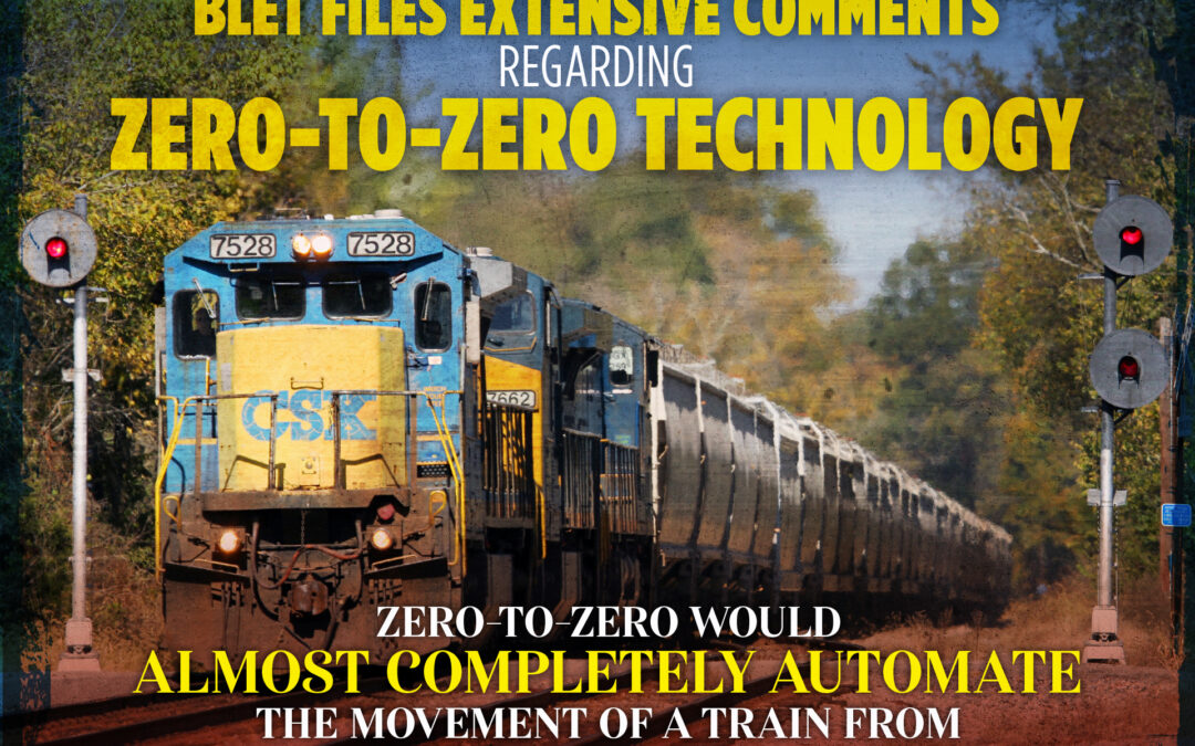 BLET’s extensive comments included 23 specific reasons why CSXT’s request should be denied. For example, while engineers are required to follow all operating and train handling rules, the BLET has identified multiple rules that would be violated while zero-to-zero has control of a train. BLET is adamant that an overreliance on this system would result in the “deskilling” of locomotive engineers. BLET is also concerned that CSX has not demonstrated that the software can respond to less than optimal conditions, such as wet weather, or that it can handle trains safely in all operational environments or during unplanned events.