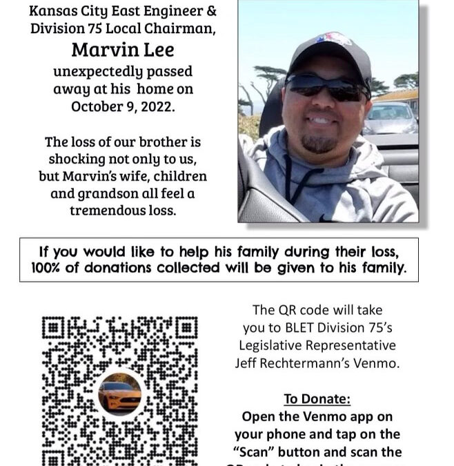 Those wishing to donate to the Lee family may do so by contacting BLET Division 75 Legislative Representative Jeff Rechtermann. Brother Rechtermann is accepting donations for the family through the Venmo app, and a QR code is provided below. One-hundred percent of all donations will be given to the Lee family.