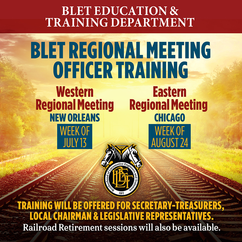 Please make your plans now to attend one or both of the BLET’s Regional Meetings this year. A key component of these events is training for Local Division officers conducted by the BLET Education and Training Department. Training will be offered for Secretary-Treasurers, Local Chairman, and Legislative Representatives. Also, seminars covering Railroad Retirement and insurance benefits are currently being planned to take place at both meetings.