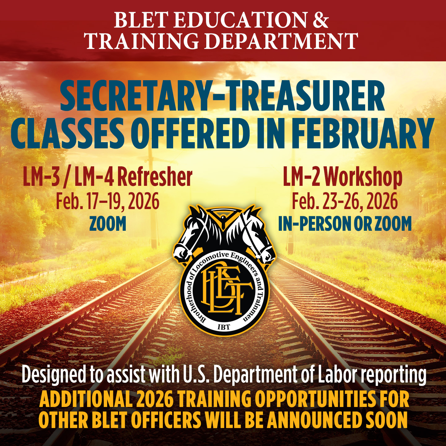 The BLET National Division Education & Training Department will offer a full slate of training opportunities throughout 2026. Two Secretary-Treasurer classes are confirmed for February: