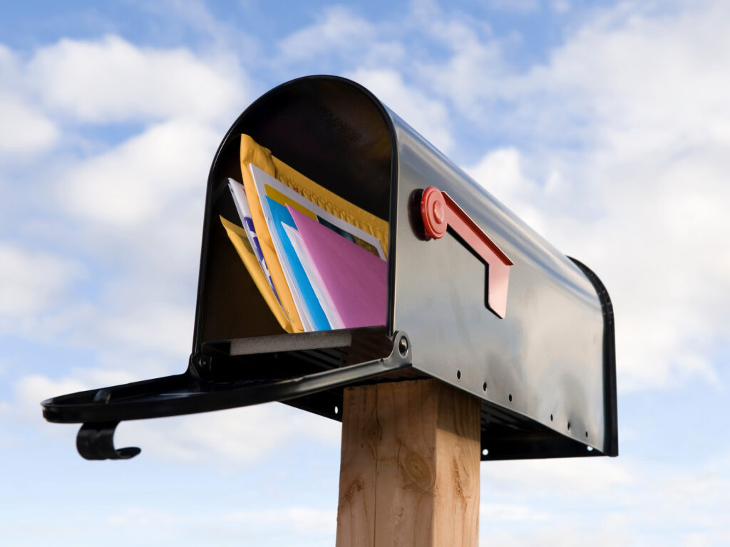 A mailbox full of mail against a blue and puffy white cloud sky