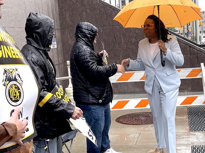 U.S. Rep. LaMonica McIver (NJ-10) came out in the rain to support BLET members on the picket line at 2 Gateway Center.