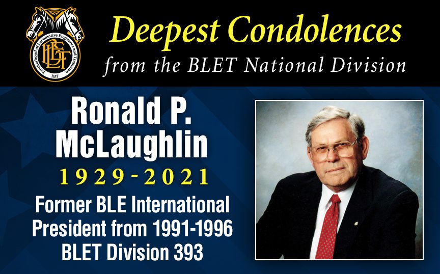 INDEPENDENCE, Ohio, November 17 — Former BLE International President Ronald P. McLaughlin passed away peacefully in his sleep at the age of 92 on November 12, 2021. He served in the union’s highest office from 1991-1996.