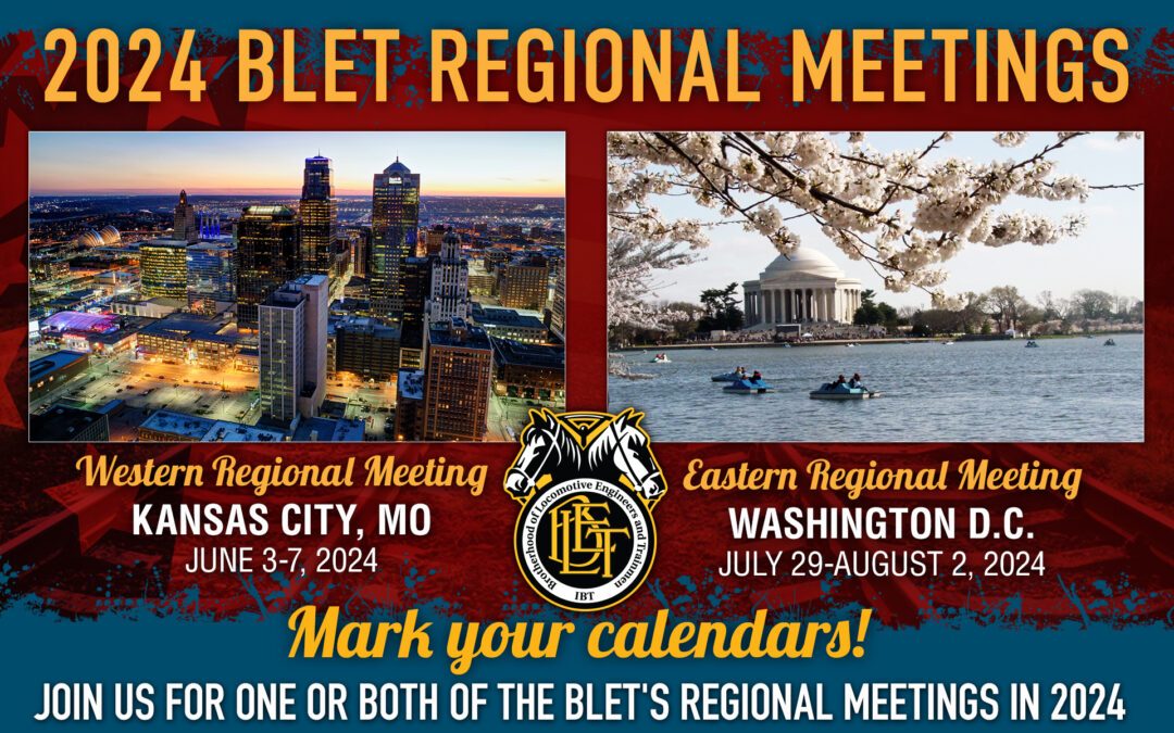 Registration is now open for the BLET’s Western Regional Meeting in Kansas City, Missouri, and the Eastern Regional Meeting in Washington, D.C. Please make your plans now to attend one or both meetings.