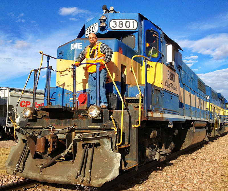 Brother Peterson pictured in 2013 on his first day after being promoted to locomotive engineer for the DM&E. Photo by Steve Guthrie