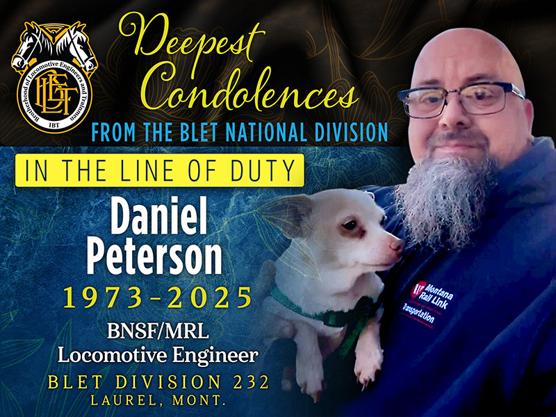 The BLET is deeply saddened by the tragic loss of Brother Daniel P. Peterson, age 52, who died on the morning of October 19 as a result of an incident while working as a conductor for BNSF Railway.