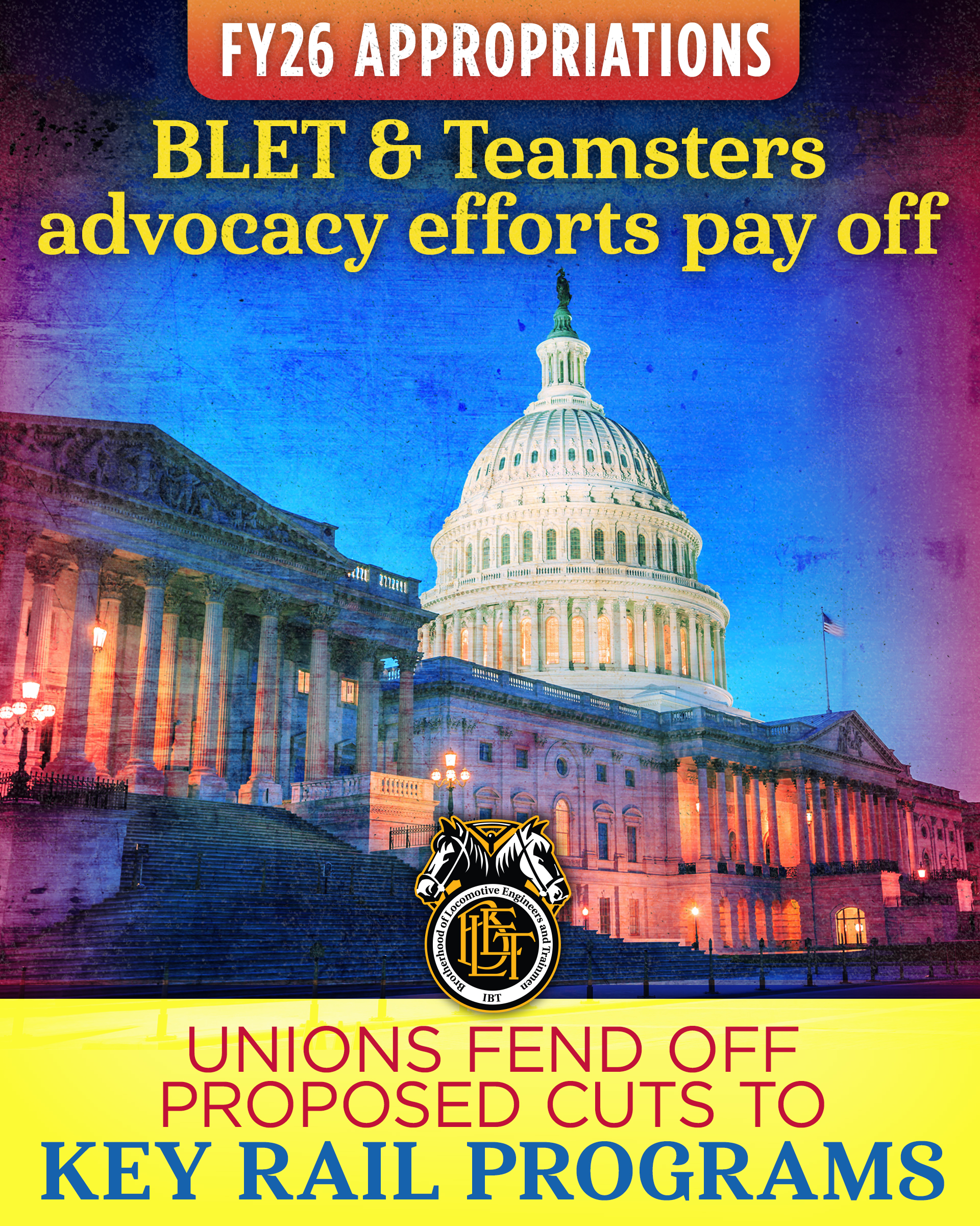 Overall, the final FY26 appropriations bills fund federal agencies important to BLET at levels similar to last year and rejects proposed cuts. This successful outcome is in no small part due to BLET and the Teamsters Rail Conference’s advocacy.