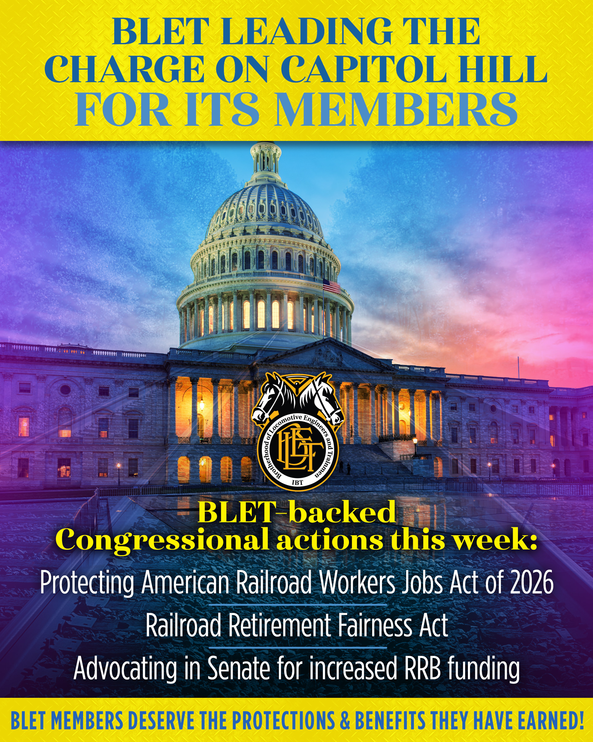 The BLET National Division has been busy on Capitol Hill this week. Ongoing advocacy on behalf of its active and retired members has resulted in three major Congressional actions in recent days. These accomplishments are summarized below.
