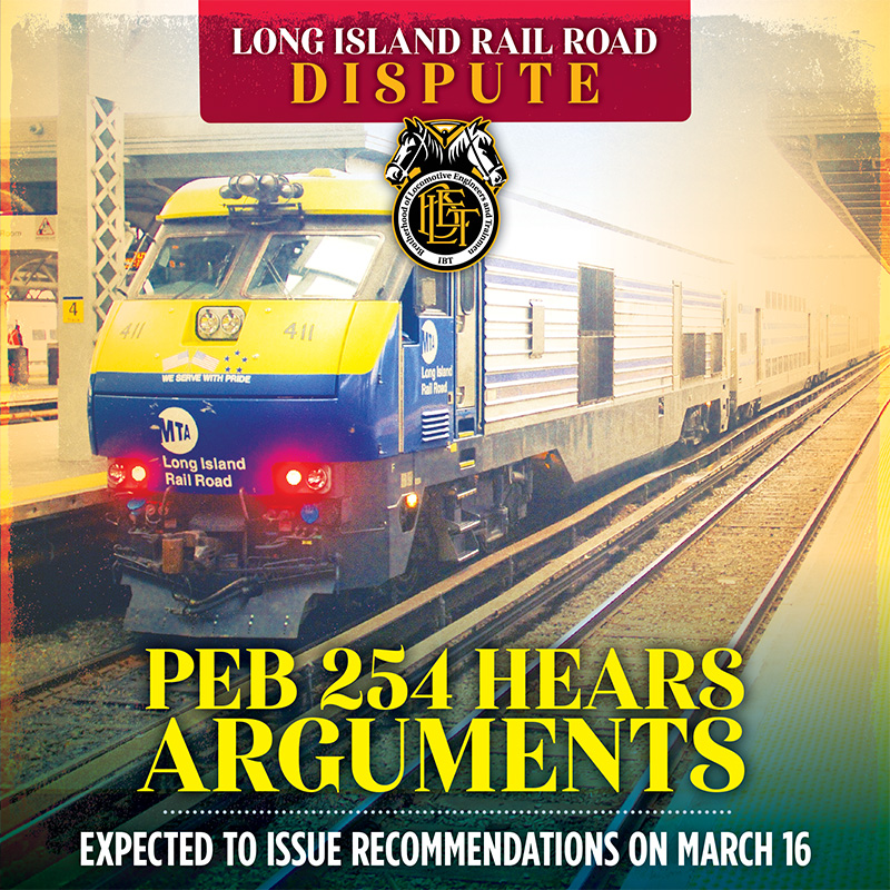 In early March, a White House-appointed mediation panel, Presidential Emergency Board 254, heard from five rail unions, including BLET, as well as the Long Island Rail Road’s management on proposals for a new agreement in the years-long contract dispute at the nation’s busiest commuter railroad. This is the second time a Presidential Emergency Board appointed by President Trump has been convened in this dispute. The Railway Labor Act allows for two PEBs in disputes involving passenger rail.