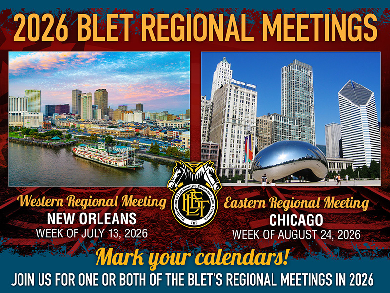 BLET members who are scheduling their vacations for next year should make plans to attend one or both of the BLET’s regional meetings in 2026. The 2026 Western Regional Meeting will be held in New Orleans, Louisiana, the week of July 13, while the 2026 Eastern Regional Meeting will take place in Chicago, Illinois, the week of August 24. The meetings give members the opportunity to engage with elected union officers, hear updates on the latest developments in the industry, and participate in valuable training classes. Additionally, the meetings are structured to include options for fellowship with other members and their families.