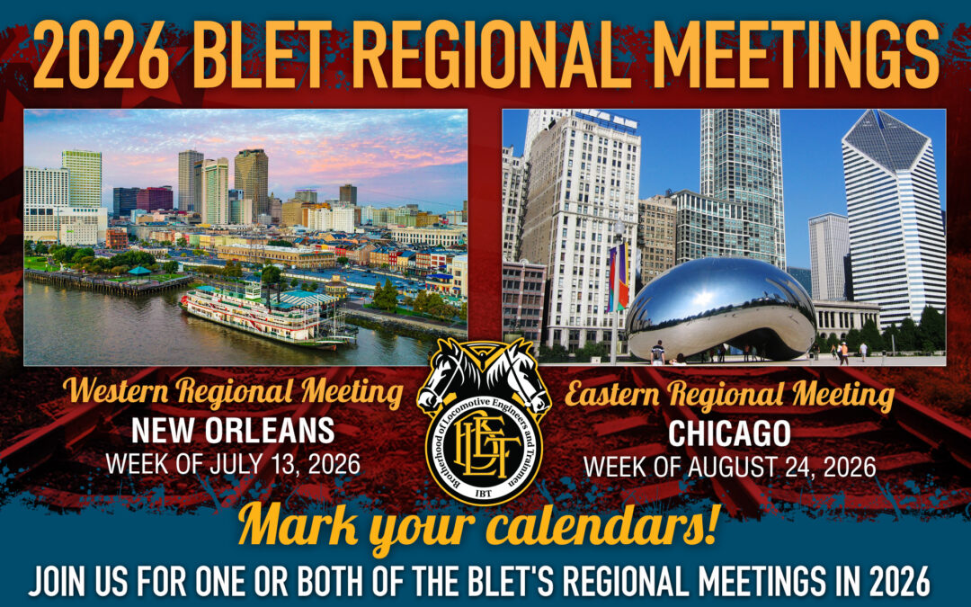 Looking ahead to next year, the BLET’s 2026 Western Regional Meeting will be held in New Orleans, Louisiana, the week of July 13. The 2026 Eastern Regional Meeting will take place in Chicago, Illinois, the week of August 24. Please make plans now to attend one or both of these meetings next year. These meetings are open to all BLET members and we hope to see you there.