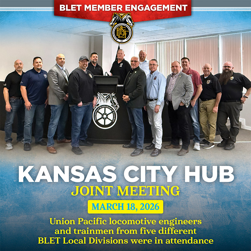 Following through on National President Mark Wallace’s commitment to engage with BLET members at union halls and local meetings across the country, rather than solely national meetings, officers of the BLET National Division traveled to Missouri this week to participate in the Kansas City Hub’s joint Division meeting on March 18.