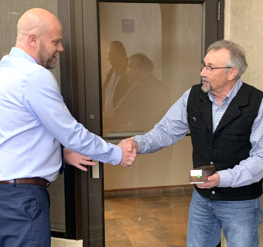 Chairman Sean Forschen (left) presents former North Dakota State Chairman Charles Weick with a retirement gift.