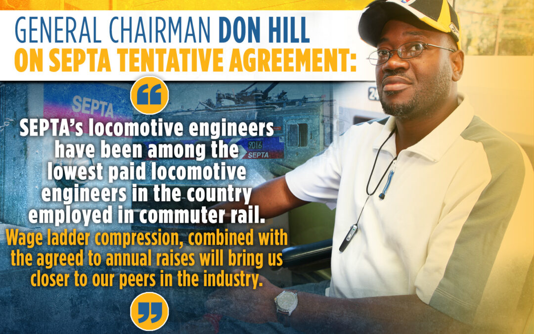 BLET General Chairman Don Hill told the Philadelphia Inquirer: “SEPTA’s locomotive engineers have been among the lowest paid locomotive engineers in the country employed in commuter rail. Wage ladder compression, combined with the agreed to annual raises, similar to what TWU 234 recently received, will bring us closer to our peers in the industry and help SEPTA recruit and retain the engineers needed to keep the trains moving.”