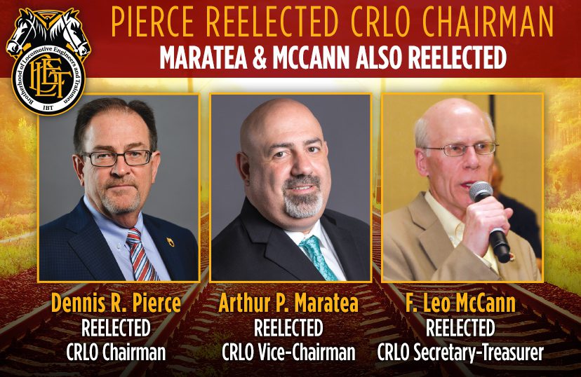 TCU/IAM National President Arthur P. Maratea and American Train Dispatchers Association (ATDA) President F. Leo McCann also were reelected by acclamation to serve the CRLO as Vice-Chairman and Secretary-Treasurer, respectively. “I am proud to continue working alongside Brothers Maratea and McCann, as well as all other members of the CRLO. I will do my utmost to preserve, protect and expand the health care benefits enjoyed by railroad workers,” President Pierce said.
