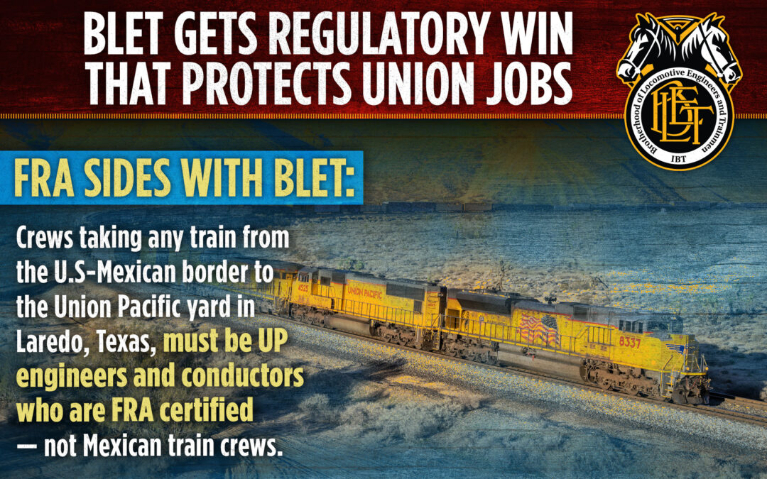 The BLET’s National Legislative Office in Washington, D.C., scored a regulatory win for BLET members last week by blocking Union Pacific’s attempt to move trains across the border into the U.S. at Laredo, Texas without stopping under certain conditions. UP interchanges with foreign-owned railroads at the U.S.-Mexico border crossing in Laredo. Under a previous administrator, the Federal Railroad Administration (FRA) gave an additional condition on the regulatory extension for Union Pacific to use foreign train crews to move trains approximately 11 miles into the United States. FRA cited BLET’s objections to UP’s petition for a waiver extension (FRA Docket Number FRA-2007-28339). BLET Vice President and National Legislative Representative Vince Verna filed the objection on December 27, 2022 on behalf of BLET. The FRA mentioned BLET’s concerns regarding the need to stop Mexican train crews from operating on American soil. FRA granted UP’s waiver extension, but clarified in an additional waiver condition that crews taking any train from the border to the UP yard in Laredo would be done by UP engineers and conductors who are FRA certified — not Mexican crews. Specifically, FRA added the following requirement in granting UP’s waiver extension: “All trains crossing the international bridge at Laredo and destined for UP’s Port Laredo Yard must be operated from the bridge to that Yard by a properly qualified and certified UP locomotive engineer and conductor.” Vice President Verna cited the need for vigilance on the issue. He said the waiver is extended for five years, but warned that UP and other railroads operating at ports along the southern border will likely attempt to find work-arounds that test the strength of Part §240 Engineer Certification and Part 242 Conductor Certification. The extension of the waiver comes up for renewal in 2027-2028. “Viva Verna,” said BLET National President Eddie Hall. “This regulatory win was due to the diligence and solid work by Brother Verna and his team at the National Legislative Office. This is a victory for BLET and all of our members who work along the border with Mexico.”