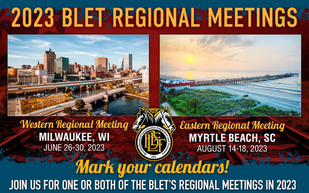 More specific details will be announced soon. Registration information will be available online at the BLET National Division’s regional meeting website (http://bletregionals.org ). All members are encouraged to attend one or both of this year’s regional meetings.