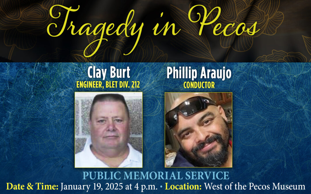 A memorial service will be held on Sunday, January 19, to honor the two Union Pacific workers who were killed in last month’s train derailment in Pecos, Texas. The ceremony is open to the public and will be held at the West of the Pecos Museum at 4:00 p.m. (120 E. Stafford St., Pecos, TX 79772).