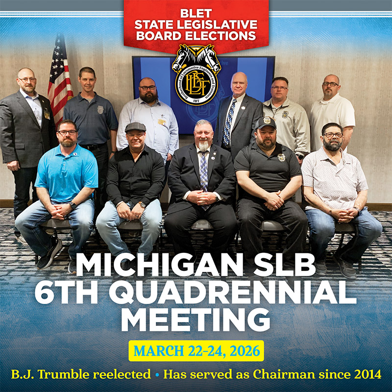 B.J. Trumble was reelected Chairman of the BLET’s Michigan State Legislative Board (SLB) at its Sixth Quadrennial meeting in Battle Creek, Mich., on March 24. The Michigan SLB represents more than 800 active and retired members from 11 different BLET Divisions.