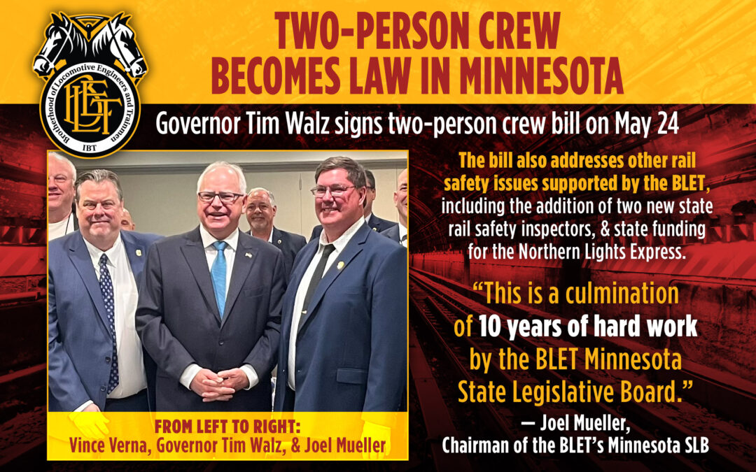 BLET Vice President & National Legislative Representative Vince Verna said: “I want to congratulate Brother Mueller for his hard work and to thank Governor Walz for signing the bill. He has long supported BLET issues since his time as a member of Congress.”