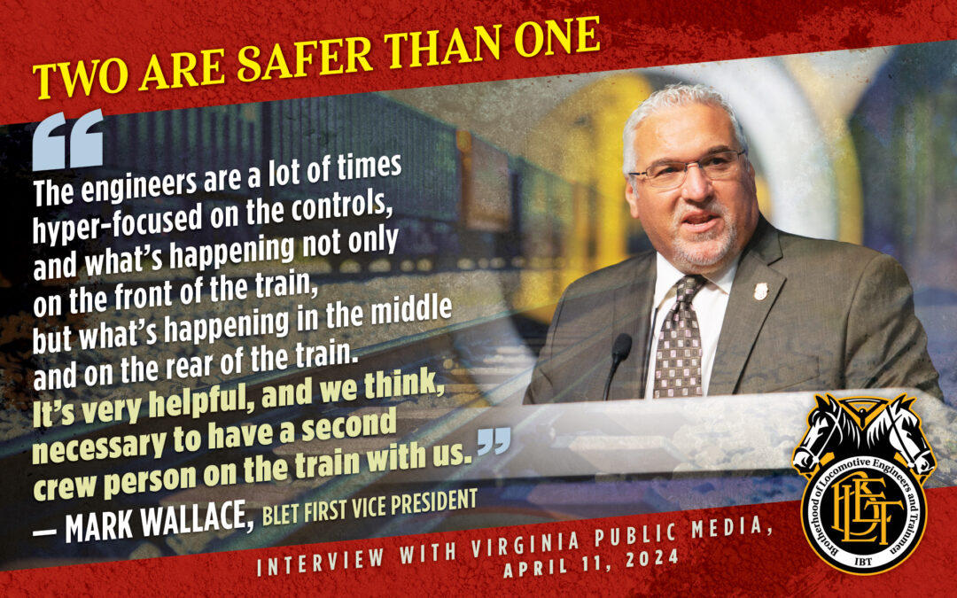 Virginia Governor Glen Youngkin recently vetoed a two-person crew bill. This week, BLET First Vice President Mark Wallace spoke to NPR’s Virginia affiliate about the Youngkin veto and the importance of two-person crew legislation. Read or listen to the story here.